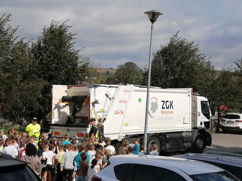 Szczególną atrakcją spotkania była wizyta nowoczesnej śmieciarki, która przyjechała specjalnie na pokaz. Uczniowie mogli z bliska zobaczyć, jak wygląda praca przy odbiorze odpadów, jak działa mechanizm załadunku i jakie procedury bezpieczeństwa towarzyszą codziennym obowiązkom pracowników.